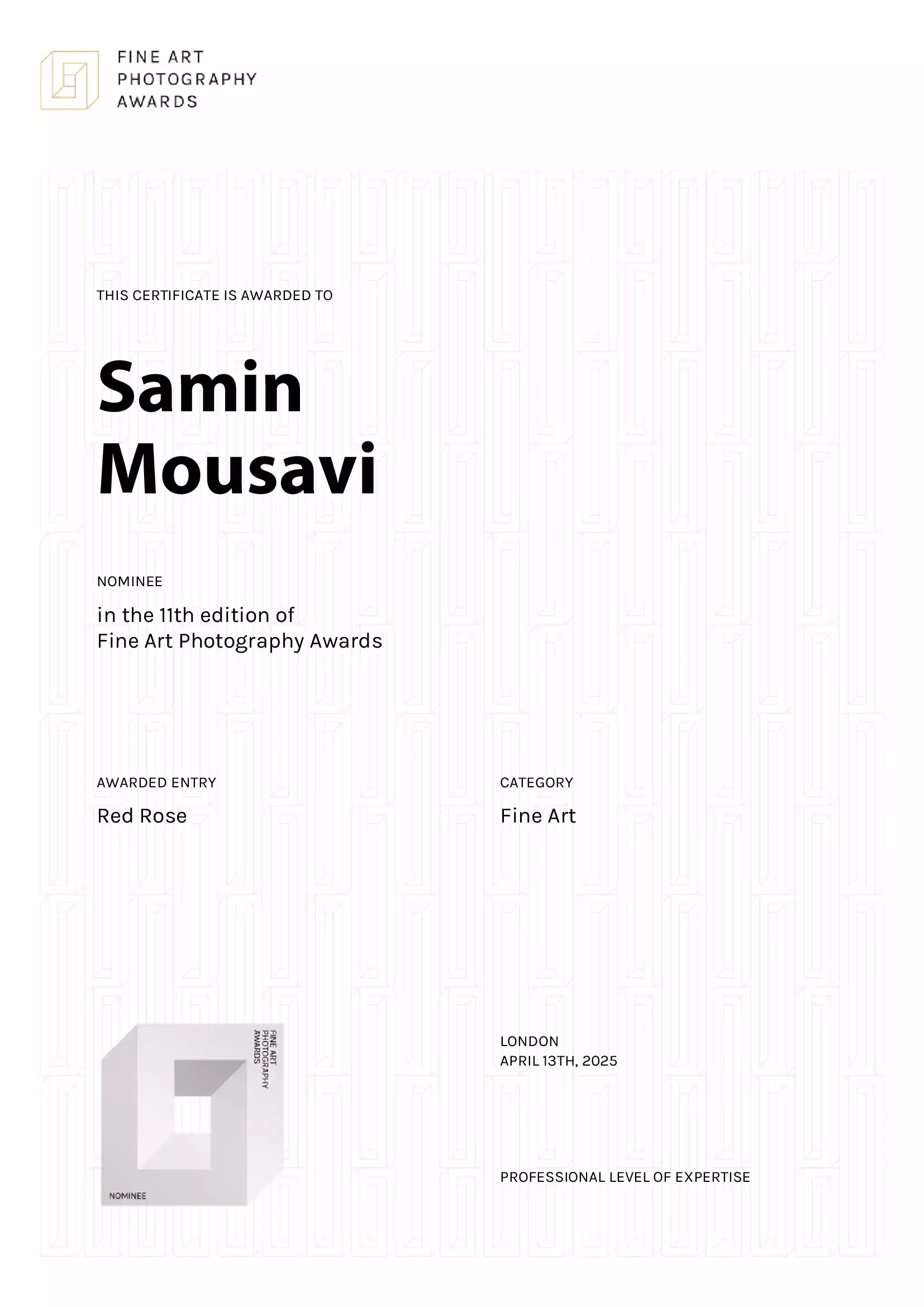 Samin Mousavi was recognized as a winner in the 11th edition (2024–2025) of the Fine Art Photography Awards (FAPA), an international competition that celebrates the creativity and originality of photographers worldwide.